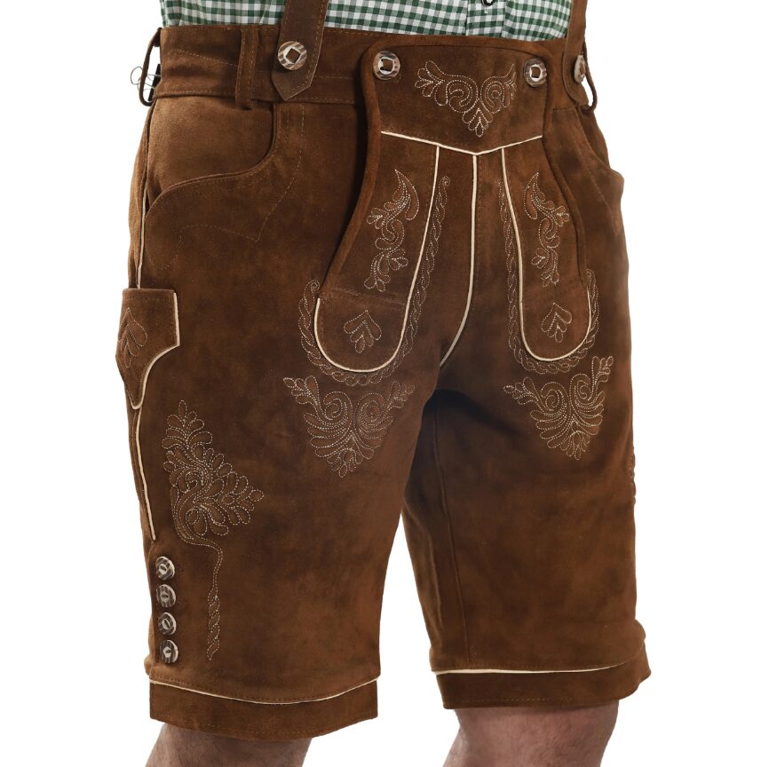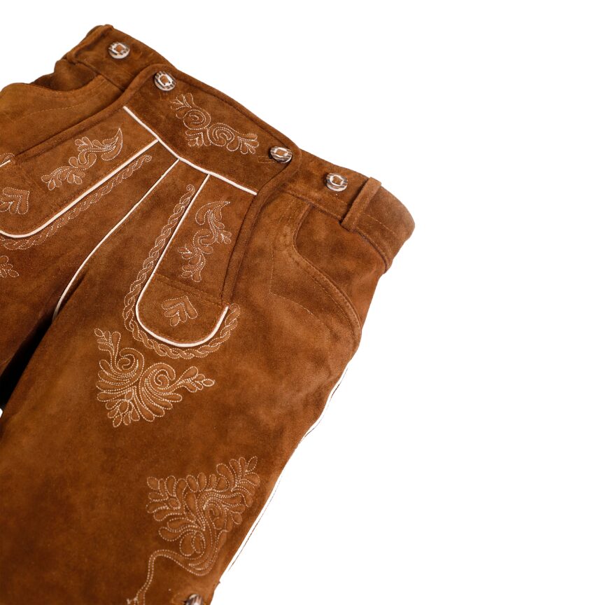 After you’ve measured your height and other body dimensions, refer to the size chart provided with each product. Each size lists a corresponding side length, which indicates the total length of the lederhosen. By comparing these with your own measurements, you can select the lederhosen length that suits you best. Even better—you’re not limited to the standard chart; you can request a custom side length for your lederhosen. At thelederhosen, we specialize in creating made-to-measure designs tailored to your preferred fit.