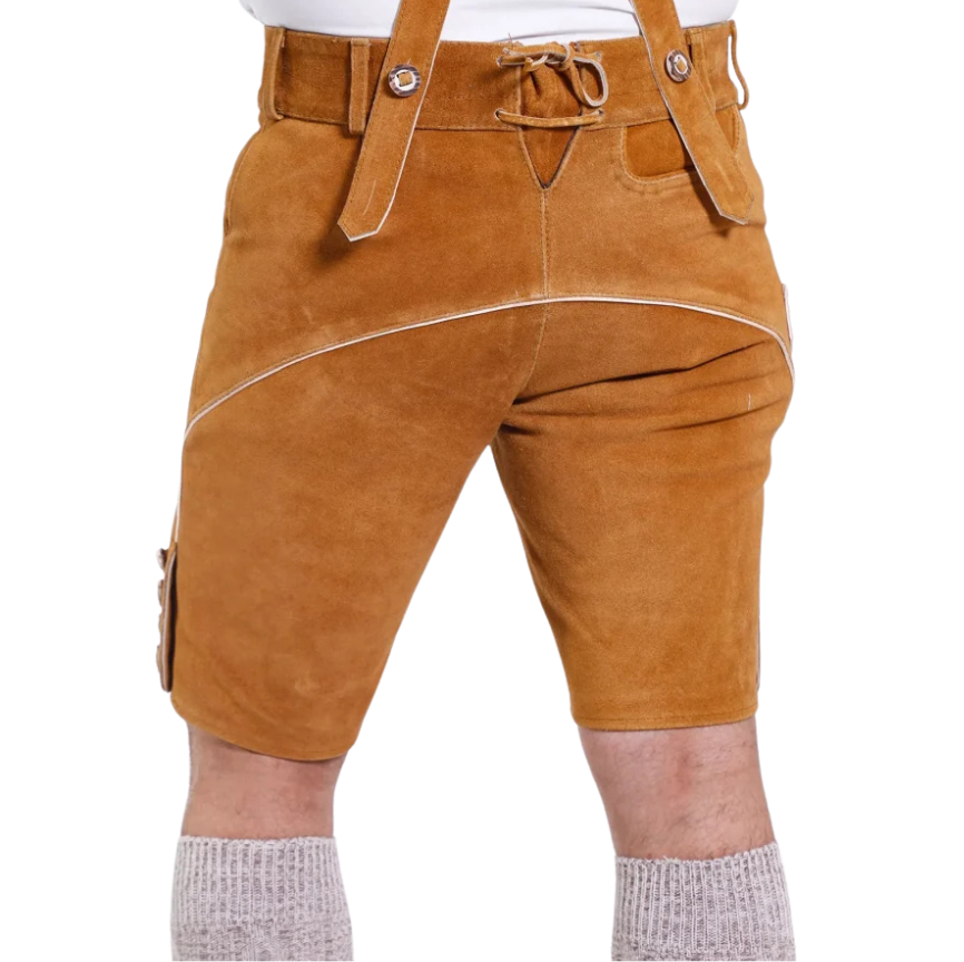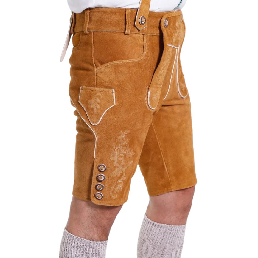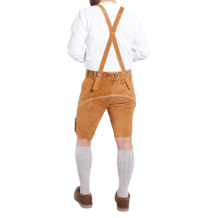 The Alpengold Lederhosen Outfit is crafted from soft golden tan suede leather, offering both durability and an elegant look. Its supple feel ensures comfort, while the sturdy build makes it perfect for repeated wear. This combination of style and resilience captures the essence of Alpine tradition with a modern touch.