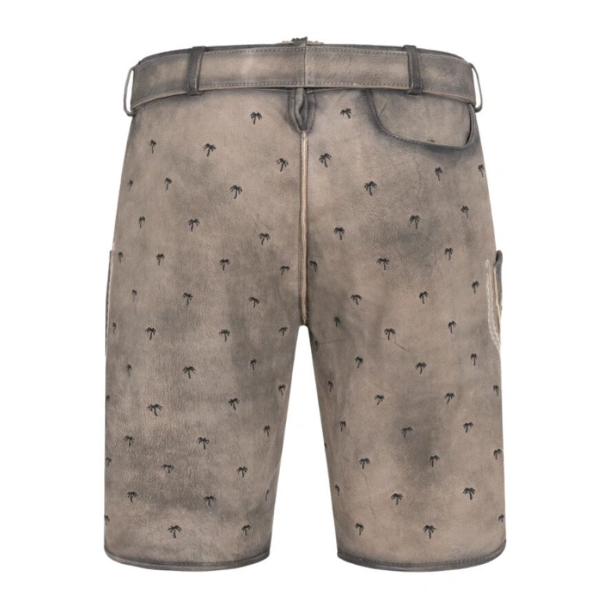 Made from soft goatskin suede, these gray lederhosen offer comfort and style in equal measure. The light color has a vintage wash, adding depth and character. Small black palm tree patterns cover the shorts, while classic Bavarian embroidery decorates the bib and thigh panels. It’s a look that’s both familiar and fresh.